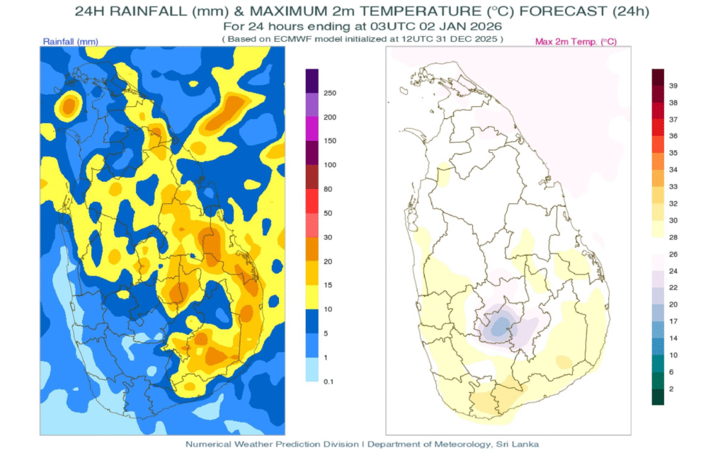 අද (ජනවාරි 01) දිනයේදී නැගෙනහිර, මධ්‍යම, උතුරු-මැද සහ ඌව පළාත්වල විටින් විට වැසි හෝ ගිගුරුම් සහිත වැසි ඇතිවන බව කාලගුණ විද්‍යා දෙපාර්තමේන්තුව පවසයි.