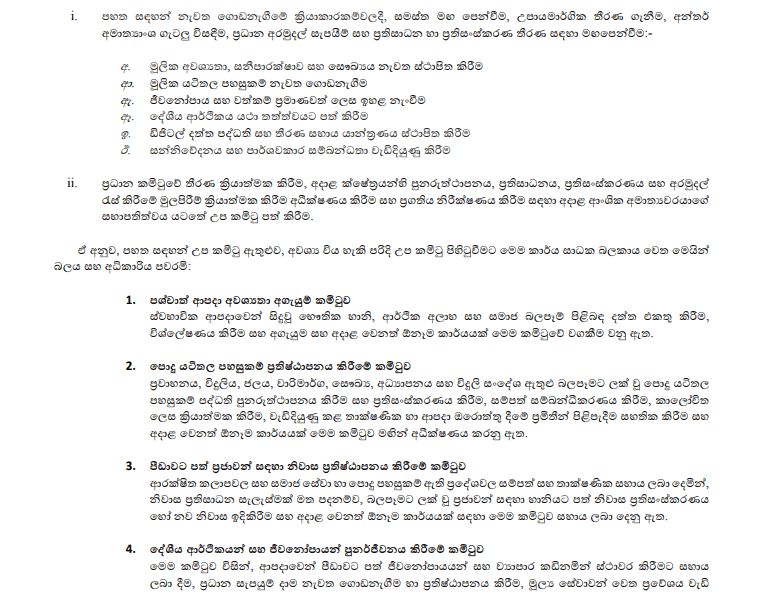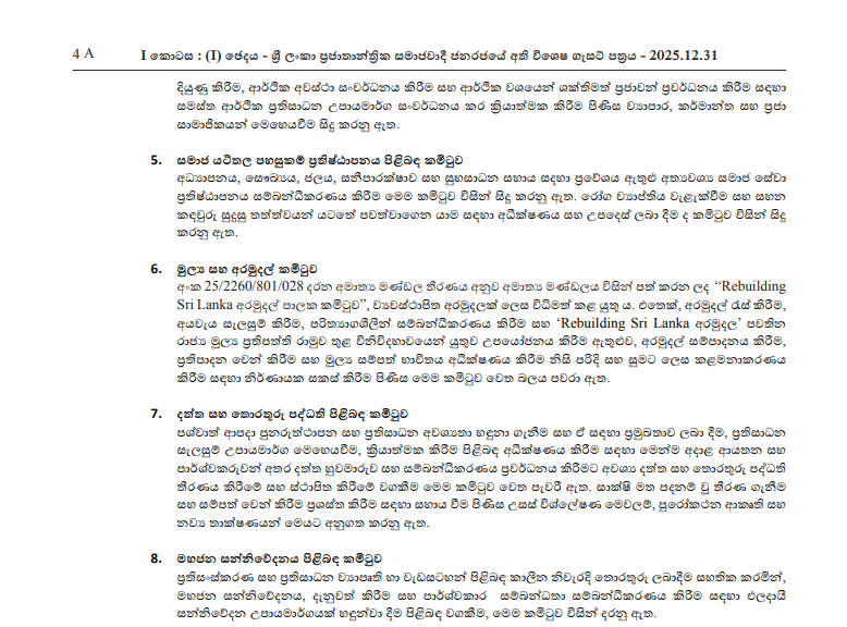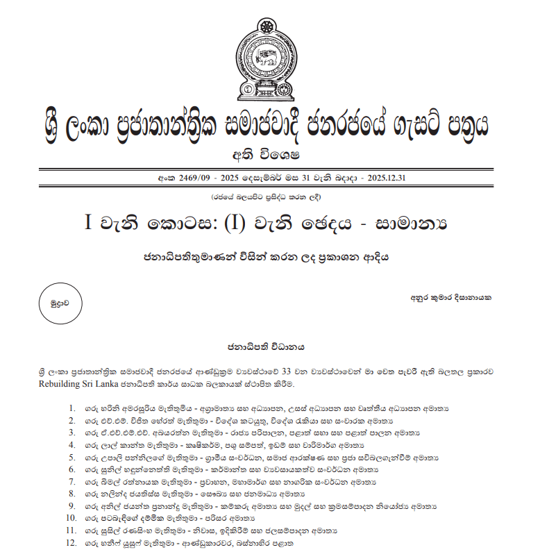 ‘දිට්වා’ සුළි කුණාටුවෙන් පසු ආපදා ප්‍රතිසාධනය, පුනරුත්ථාපනය සහ ප්‍රතිසංස්කරණ කටයුතු සම්බන්ධීකරණය කිරීම සඳහා ජනාධිපති අනුර කුමාර දිසානායක මහතා විසින් ‘Rebuilding Sri Lanka’ ජනාධිපති කාර්ය සාධක බලකාය ස්ථාපනය කර තිබේ.