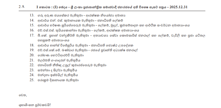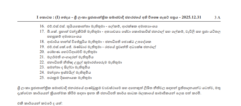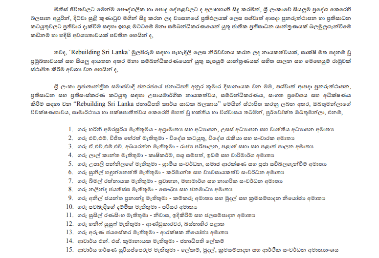අතිවිශේෂ ගැසට් නිවේදනයක් මගින් අග්‍රාමාත්‍ය හරිනි අමරසූරිය ඇතුළු 25 දෙනෙකුගෙන් සමන්විත මෙම ජනාධිපති කාර්ය සාධක බලකාය ජනාධිපතිවරයා විසින් නම්කර ඇත.