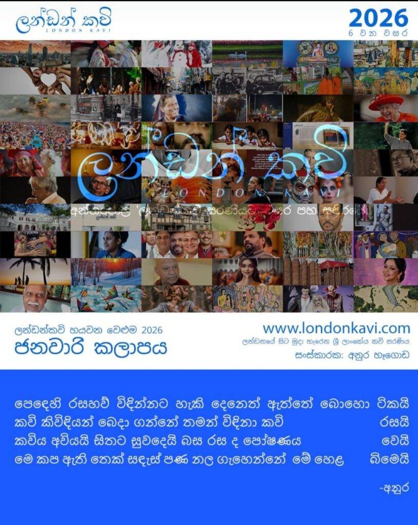 2003 දී මුද්රිත මාධ්යයෙන් ඇරැඹි ‘ලන්ඩන් කවිය’ 2021 ජනවාරි යෙහි සිට අන්තර්ජාල කලාපයක් ලෙස අද වනතුරු නොකඩවා සෑම මසකම 1 දා ඔබ හමුවට ගෙන ආවෙමු. එදා සිට අද දක්වා පළවූ පිටකවර හැටෙන් මෙවර කලාපයේ කවරය හැඩ වෙයි.එදා මෙදා තුර මෙහි කවි කිවිඳියන් 675 කගේ නිර්මාණ 5341 ක් පලවී තිබේ. මෙයට දායක වූ ඔබට ද, පාඨක සැමට ද අපගේ නොමඳ සෙනෙහස සහ කෘතඥතාවය හිමිවේ.