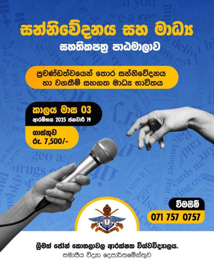 කොළඹ LNW:ශ්රීමත් ජෝන් කොතලාවල ආරක්ෂක විශ්වවිද්යාලය විසින් පවත්වන අවිහිංසාවාදී සන්නිවේදනය සහ මාධ්ය පාඨමාලාව සඳහා අයදුම්පත් භාර ගැනීම ආරම්භ වී තිබේ.