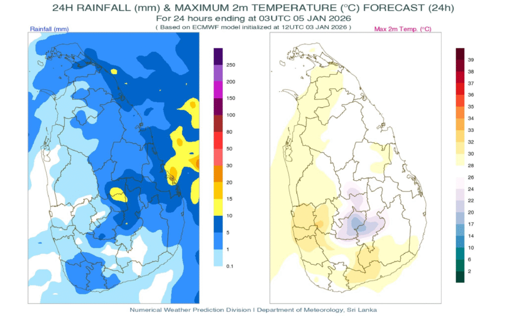 ඒ අනුව අද (ජනවාරි 04) දිනයේදී නැගෙනහිර සහ ඌව පළාත්වලත් පොළොන්නරුව, මාතලේ සහ නුවරඑළිය දිස්ත්රික්කවලත් විටින් විට වැසි ඇති වේ.