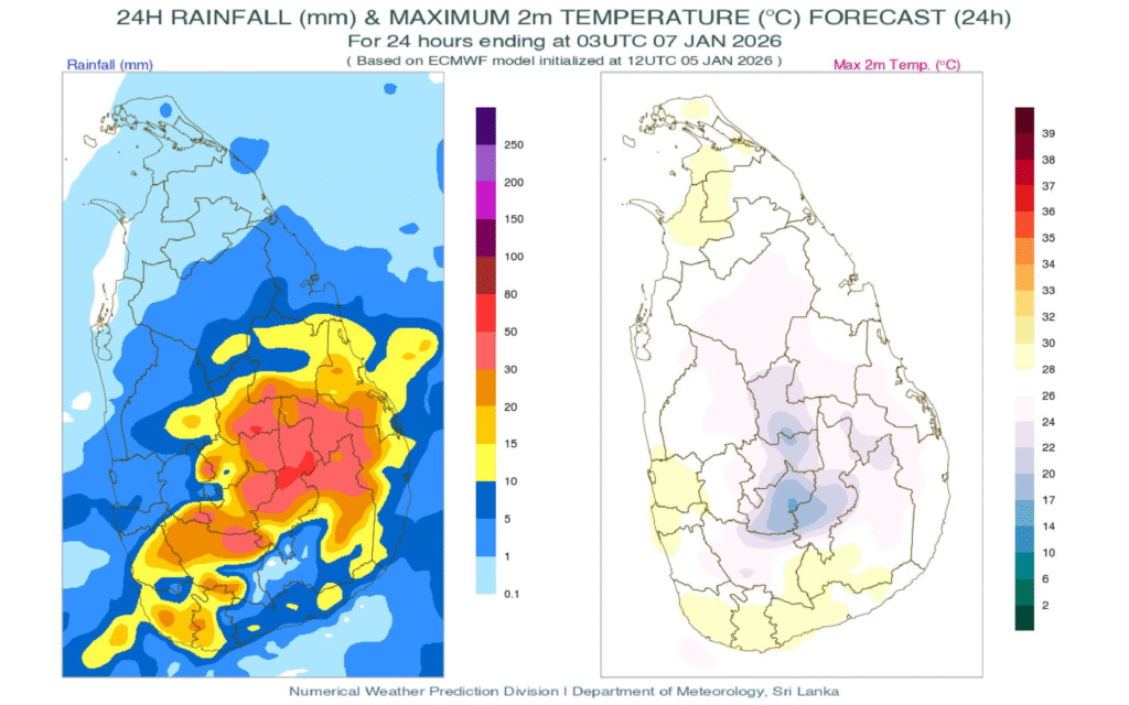 ඒ අනුව, අද (ජනවාරි 06) දිනයේදී නැගෙනහිර, මධ්යම, ඌව, උතුරුමැද සහ උතුරු පළාත්වල විටින් විට වැසි ඇතිවේ. ඌව පළාතෙත් නුවරඑළිය, මාතලේ, පොළොන්නරුව, මඩකළපුව සහ අම්පාර දිස්ත්රික්කවලත් ඇතැම් ස්ථානවලට මි.මී. 100 පමණ තද වැසි ඇති විය හැක.