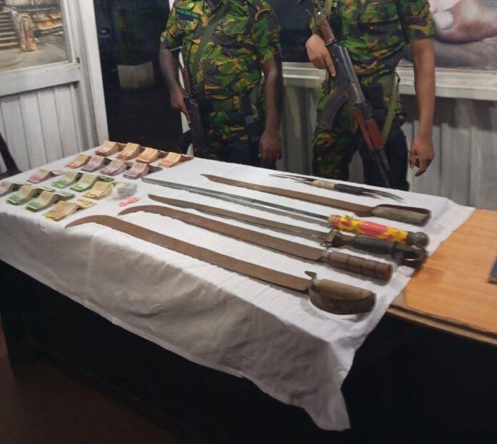 හෙරොයින් ග්රෑම් 6 සහ ගංජා ග්රෑම් 10 ක් සන්තකයේ තබා ගැනීම, මත්ද්රව ජාවාරමේ උපයා ගන්නා ලද රු : 467,000/-(රුපියල් හාර ලක්ෂ හැට හත්දාහයිසහ කඩු පහක් උල් ආයුධයක් සන්තකයේ තබා ගෙන සිටියදී, අංක : 156/බී , කනත්ත පාර, බොරලැස්ගමුවදී 2024.01.06 දින අත්අඩංගුවට ගෙන ඇති බව පොලිසිය පවසයි.