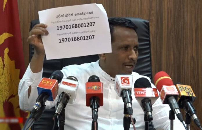 “දැන් මේ ඉඩම් කවුද අරගෙන තියෙන්නෙ ? කේ. ටී. රංජිත්. හොයාගෙන ගියාම මේකෙ තියෙනවා හැඳුනුම්පත් අංකයක්. ඒ හැඳුනුම්පත් අංකයෙන් හොයාගන්න පුළුවන්නෙ මේ කීර්ති තෙන්නකෝන්ද කියලා. අපට හම්බවෙනවා මෙයාගෙ ඉල්ලුම් පත්රයේ දාලා තියෙන හැඳුනුම්පත් අංකය තමයි මේ උඩින් තියෙන්නෙ, මේකෙ අංක 13ක් තියෙනවා. අර සිරිලිය වගේ තමා මේවාත්. එයාගෙ ඇත්ත හැඳුනුම්පත් අංකය අපි හොයාගත්තා, මේ යටින් තියෙන්නෙ ඒක. බලනකොට උඩ එකේ බිංදුවක් වැඩියි. බිංදුව අයින් කරලා ගත්තාම කීර්ති තෙන්නකෝන්ගෙ තමයි හැඳුනුම්පත් අංකය. අන්න එයා තමයි කේ. ටී. රංජිත් කියන ඇප්ලිකේෂන් එක ඉදිරිපත් කරලා තියෙන්නෙ. හිටපු ආණ්ඩුකාරවරයා, ජනාධිපති ලේකම්වරයෙක්. මෙයා මේකෙ අරන් තියෙනවා අක්කර 18ක් තියෙනවා ඉඩම. මඩෙන් පහයි, ගොඩින් දහතුනයි. දැන් මේකෙ තියෙනවා වංචාවක්. කීර්ති තෙන්නකෝන්ගෙ අත්සන ව්යාජයි. කීර්ති තෙන්නකෝන්ගෙ ඇත්ත අත්සන මේ තියෙන්නෙ, මේ තියෙන්නෙ තමන් ඉඩම් ඉල්ලන්නෙ නෑ කියන්න ව්යාජව ගහපු අත්සන. දැන් මේ කීර්ති තෙන්නකෝන්ට මෙතන ඉඩමක් තියෙනවා කියලා මම වීඩියෝ එක්කුත් පෙන්වන්නම්”