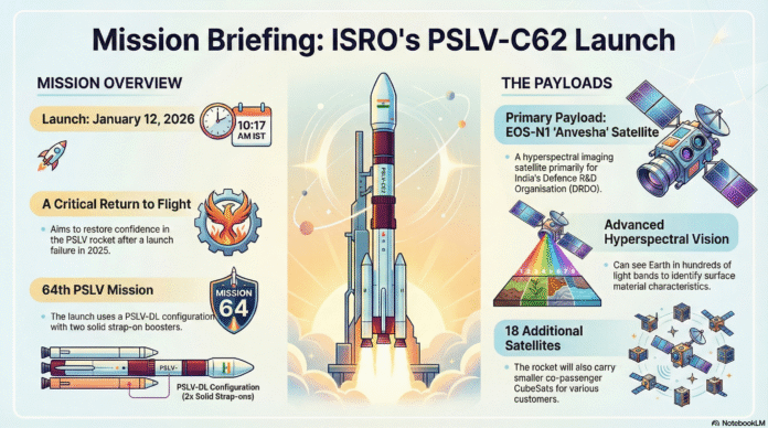 • දියත් කිරීම: ISRO ආයතනය විසින් PSLV-C62 රොකට්ටුව 2026 ජනවාරි 12 වන දින පෙරවරු 10:17 ට ශ්‍රීහරිකෝටා සිට දියත් කිරීමට සැලසුම් කර ඇත.
