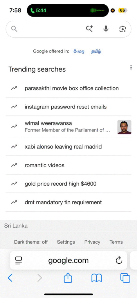ජාතික නිදහස් පෙරමුණේ නායක විමල් වීරවංශ මහතා ගතවූ පැය 24 තුළ මෙරට Google Trending Searches අතර තුන්වැනි ස්ථානයට පැමිණ තිබේ.