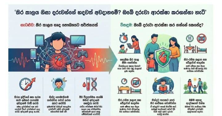 මෙමගින් රුධිර පීඩනය ඉහළ යාම සහ කොලෙස්ටරෝල් මට්ටම වෙනස් වීම වැනි අහිතකර ලක්ෂණ මතු විය හැකි බව පර්යේෂකයෝ පෙන්වා දෙති. දරුවන්ගේ හෘද සෞඛ්‍යය ආරක්ෂා කර ගැනීම සඳහා දෛනික තිර කාලය පැය දෙකකට සීමා කිරීම සහ නින්දට පෙර විද්‍යුත් මෙවලම් භාවිතයෙන් වැළකී සිටීම අත්‍යවශ්‍ය වේ. මීට අමතරව, දෙමාපියන් ආදර්ශමත් වෙමින් දරුවන්ව එළිමහන් ක්‍රියාකාරකම් සහ නිර්මාණාත්මක විනෝදාංශ වෙත යොමු කිරීමේ වැදගත්කම මෙම ලිපිය අවධාරණය කරයි. මෙවැනි යහපත් පුරුදු ඇති කිරීම මගින් අනාගතයේදී ඇති විය හැකි බරපතල සෞඛ්‍ය ගැටලු රැසකින් දරුවන් මුදා ගත හැකිය.