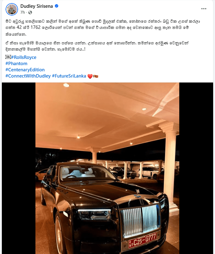 අරලිය සහල් ව්යාපාරයේ අධිපති, කෝටිපති ව්යාපාරික ඩඩ්ලි සිරිසේන මහතා මිලදීගත් නවතම මෝටර් රථය වන Rolls-Royce Phantom 8 Series 2 EWB මෝටර් රථය රේගු කටයුතු අවසන් කර නිවසට රැගෙන ගොස් තිබේ.