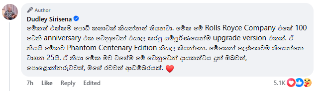 මෙම මෝටර් රථය රොල්ස් රොයිස් සමාගමේ 100 වැනි සංවත්සරය වෙනුවෙන් විශේෂයෙන් නිෂ්පාදන කළ මාදිලියක් වන අතර එයින් ලෝකයටම ඇත්තේ මෝටර් රථ 25ක් පමණක් බවයි ඩඩ්ලි සිරිසේන මහතා සඳහන් කරන්නේ.