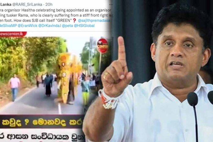 SJB Mahara organisor Hasitha celebrating being appointed as an organisor using limping tusker Rama, who is clearly suffering from a stiff front right leg and swollen foot. How does SJB call itself "GREEN"❓ @sajithpremadasa @HarshadeSilvaMP @EranWick @DrKavindaJ @peta @HSIGlobal pic.twitter.com/TfdzIC3BNn
