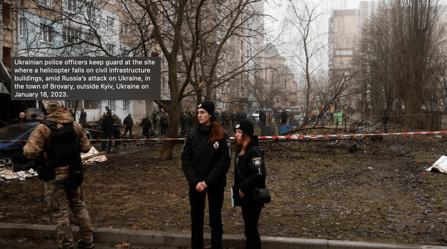 මිය ගිය පිරිස අතර, යුක්රේනයේ අභ්‍යන්තර කටයුතු අමාත්‍ය ඩෙනිස් මොනාස්ටිර්ස්කි, ඔහුගේ පළමු නියෝජ්‍ය අමාත්‍යවරයා, සහ රාජ්‍ය ලේකම්වරයා ද සිටින බව සඳහන්.