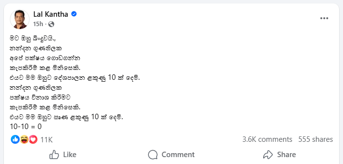 නන්දන ගුණතිලක මහතාගේ අභාවයෙන් පසු ලාල්කාන්ත අමාත්යවරයා සිය ෆේස්බුක් පිටුවෙහි තබා ඇති සටහන පහතින් දැක්වේ.