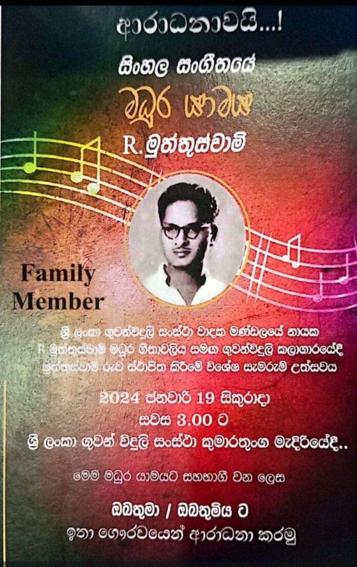 ජනවාරි 19 වොෂින්ටන් LNW : මෙරට සංගීත ක්ෂ්‍රේත්‍රයට විශාල මෙහෙයක් සිදුකල ප්‍රවීන සංගීතඥ ආර්. මුත්තුසාමි මහතා ගේ සේයාරුවක් මෙම ජනවාරි 19 දා ගුවන්විදුලියේ කුමාරතුංග  මැදිරියේදී විවෘතවීමට නියමිතය.