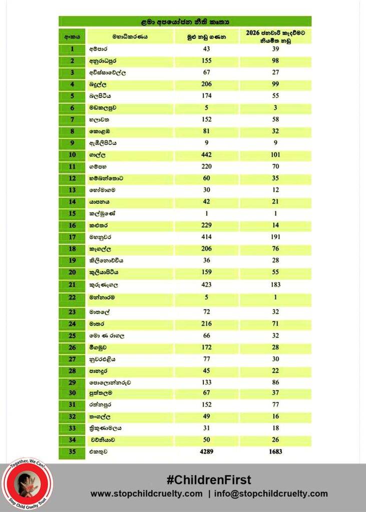 ජනවාරි 24, කොළඹ (LNW): දශක තුනකට ආසන්න කාලයක් පුරා පැවති දැඩි නිහඬතාවය, ප්රමාදය සහ ආයතනික අසමත්භාවය බිඳ දමා අවසානයට ලංකාව ළමා අපයෝජන නඩු සම්බන්ධයෙන් වැදගත් නමුත් දැඩි ලෙස ප්රමාද වූ පියවරක් ගෙන තිබේ.ඒ 2016 අංක 16 දරණ තොරතුරු දැනගැනීමේ පනත යටතේ සහ තොරතුරු දැනගැනීමේ කොමිසමේ නියෝගයකට අනුව ජාතික ළමා ආරක්ෂණ අධිකාරිය (NCPA) විසින් දිවයින පුරා මහාධිකරණ ඉදිරියේ විභාග වෙමින් පවතින ළමා අපයෝජන නඩු පිළිබඳ සවිස්තරාත්මක දත්ත ප්රථම වරට මහජනතාවට නිකුත් කර ඇත.