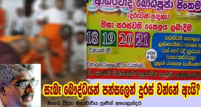 “බෞද්ධයන් පන්සලෙන් දුරස් වී නැත. සිදුව ඇත්තේ සැබෑ බෞද්ධයන් ගෙන් පන්සල දුරස් වීමකි”. ඉහත සඳහන් වූයේ මගේ හිතවත් ප්රවීණ මාධ්යවේදියකු මෑත දිනයක තම සමාජ ජාල ගිනුමක තබා ඇති සටහනකි. ඒ අනුව ඉන්පසු ඔහුට දුරකථනයෙන් කතා කළ මම එවැනි සටහනක් තැබීමට ආසන්නම හේතුව කුමක්දැයි ඔහුගෙන් අසා සිටියෙමි. ඊට පිළිතුරු වශයෙන් ඔහු තමන් පදිංචි ප්රදේශයට ආසන්න විහාරස්ථානයක් ඉදිරියේ ප්රදර්ශනය කෙරෙමින් තිබූ බැනරයක ඡායාරූපයක් ම’වෙත යොමු කොට තිබිණ. එය මෙරට අධ්යයන පොදු සහතික පත්ර උසස් පෙළ විභාගයට පෙනී සිටින දරුවන් උදෙසා සිදු කරන බව පැවසෙන ‘ආශිර්වාද බෝධි පූජා’පින්කමක් පිළිබඳ ප්රචාරක පුවරුවකි. මූලික බුදු සමය හා කිසිදු සබැදියාවක් නොමැති ‘ආශිර්වාද පූජා’ නමින් හඳුන්වන මෙම ශාන්තිකර්ම විශේෂය අද වන විට නූතන ජනප්රිය බුද්ධාගම තුළ ශීඝ්ර ව්යාප්තියකට ලක් වෙමින් තිබේ. නමුදු මෙම ප්රචාරක පුවරුවේ සඳහන් විශේෂත්වය එය නොවේ. එම විභාගයට පෙනී සිටින දරුවන් සඳහා “මහා සරස්වතී තෛලය’ ලබා දීම ද සිදු කෙරෙන බැවින් එය ලබා ගැනීමට අවශ්ය අය “රන් හෝ රිදී” සුරයක් සමඟ කහ, කළු හෝ රතු නූලක් ද රැගෙන පැමිණෙන ලෙස එමගින් දැනුම් දී තිබීම ය.