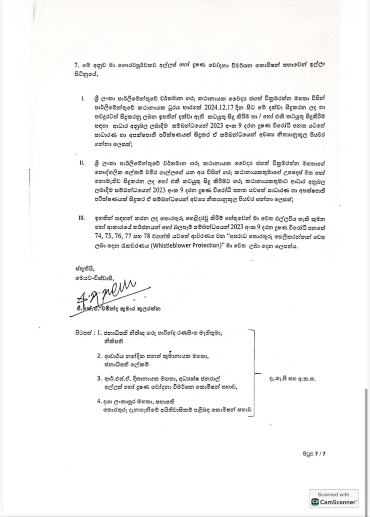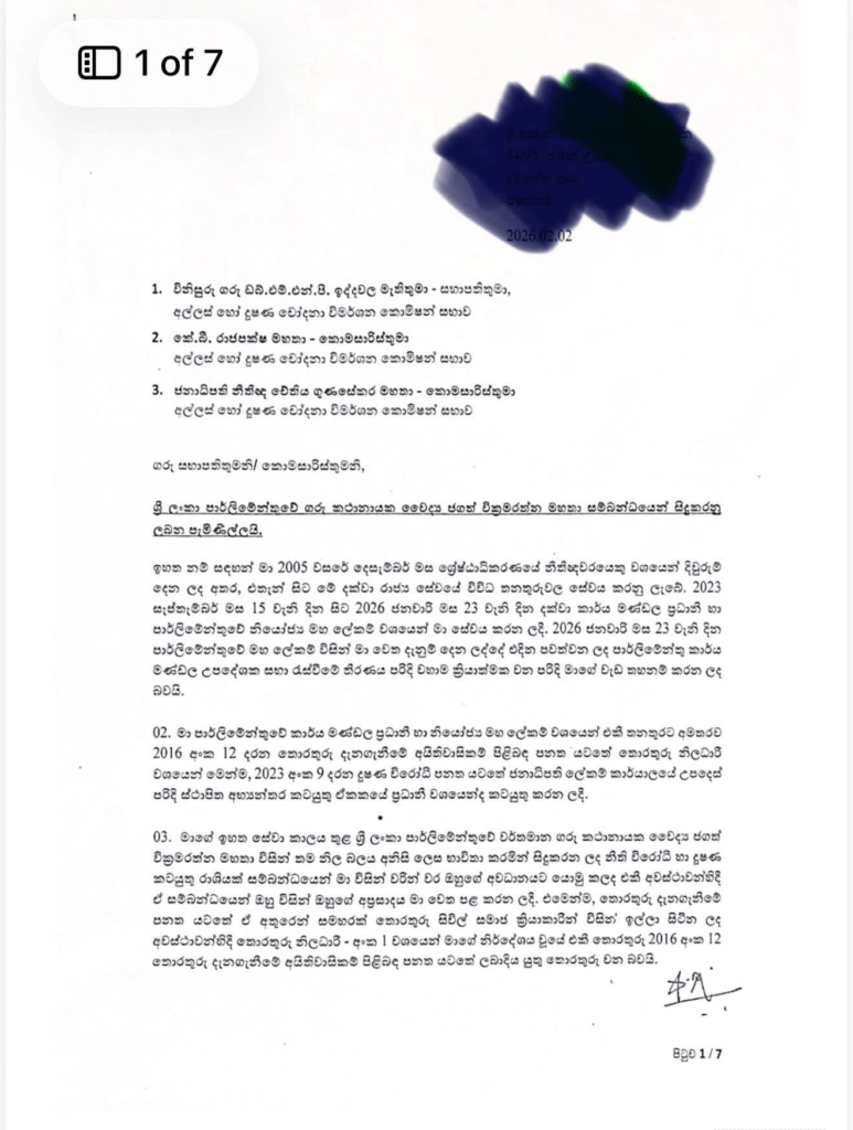 වැඩතහනමට ලක්වූ පාර්ලිමේන්තුවේ නියෝජ්ය මහලේකම් චමින්ද කුලරත්න මහතා විසින් කථානායක වෛද්ය ජගත් වික්රමරත්න මහතාට එරෙහිව ඊයේ (02) අල්ලස් හෝ දූෂණ චෝදනා විමර්ශන කොමිසමට පැමිණිල්ලක් ඉදිරිපත් කර තිබිණි.