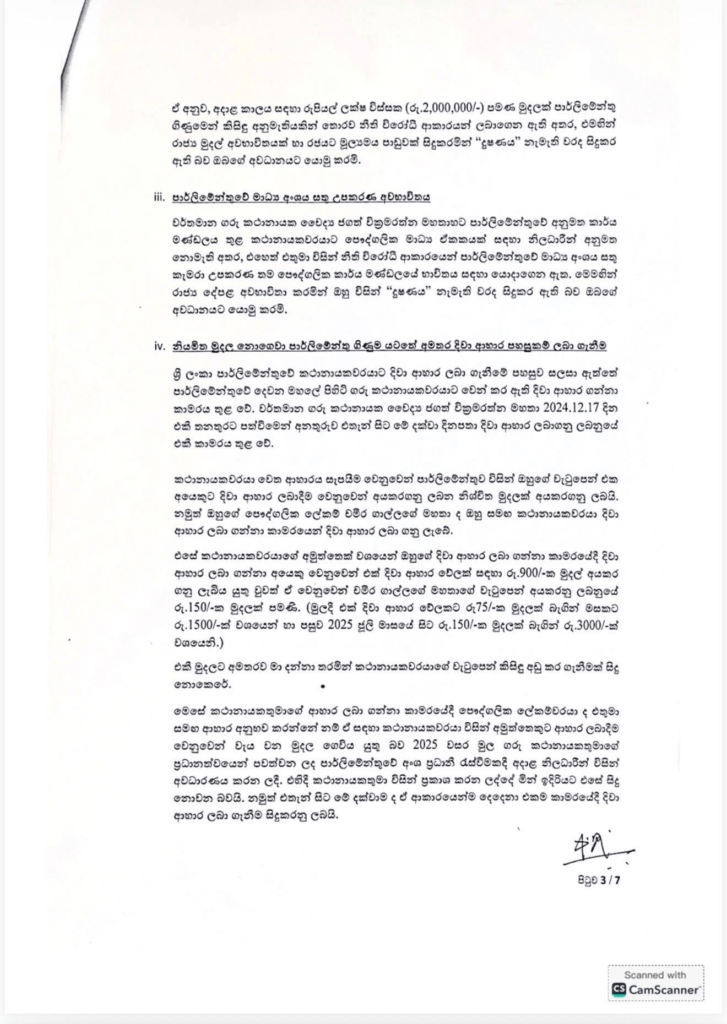 නියමිත මුදල නොගෙවා පාර්ලිමේන්තු ගිණුම යටතේ අමතර දිවා ආහාර පහසුකම් ලබාගැනීම