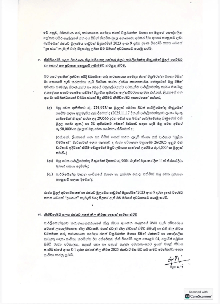 නීතිවිරෝධී ලෙස විමර්ශන නිලධාරියකු පත්කර ඔහුට පාර්ලිමේන්තු ගිණුමෙන් මුදල් ගෙවීමටත් ආහාර හා ප්රවාහන පහසුකම් සැපයීමටත් කටයුතු කිරීම