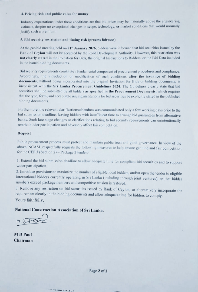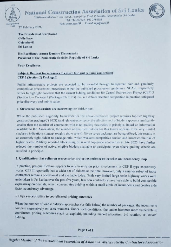 ජාතික ඉදිකිරීම් සංගමය ජනාධිපති අනුර කුමාර දිසානායක මහතා වෙත මේ බව ලිඛිතව දැනුම් දෙමින් ඉල්ලා ඇත්තේ මෙම ටෙන්ඩරයේදී තරගකාරීත්වය ශක්තිමත් කිරීම, විවෘතභාවය ආරක්ෂා කිරීම සහ මහජන මුදල් සඳහා උපරිම වටිනාකම ලබාදීම සඳහා අවශ්‍ය පියවර ගන්නා ලෙසයි.