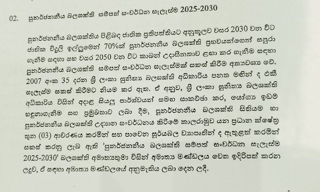 පුනර්ජනනීය බලශක්ති සම්පත් සංවර්ධන සැලැස්ම 2025‑2030 සඳහා අමාත්‍ය මණ්ඩලයේ අනුමැතිය හිමිව තිබේ.
