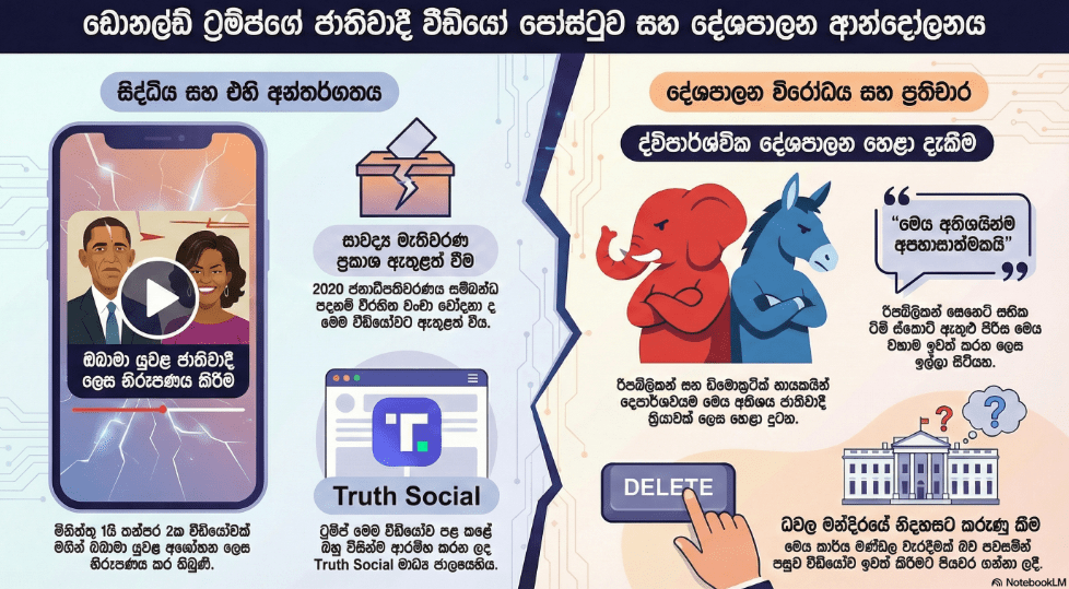 හිටපු ජනාධිපති බරක් ඔබාමා සහ ඔහුගේ බිරිඳ මිෂෙල් ඔබාමා වානරයන් ලෙස නිරූපණය කරන ලද වර්ගවාදී වීඩියෝවක් ඩොනල්ඩ් ට්රම්ප් විසින් සිය සමාජ මාධ්ය ගිණුමේ පළ කිරීම හේතුවෙන් දැඩි ආන්දෝලනාත්මක තත්ත්වයක් ඇතිවූ බව විදෙස් මාධ්ය පෙන්වා දෙයි.