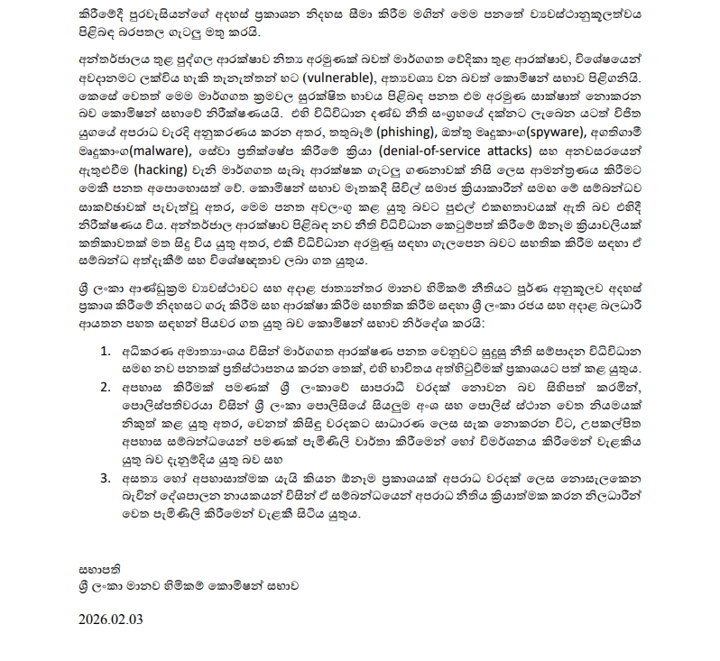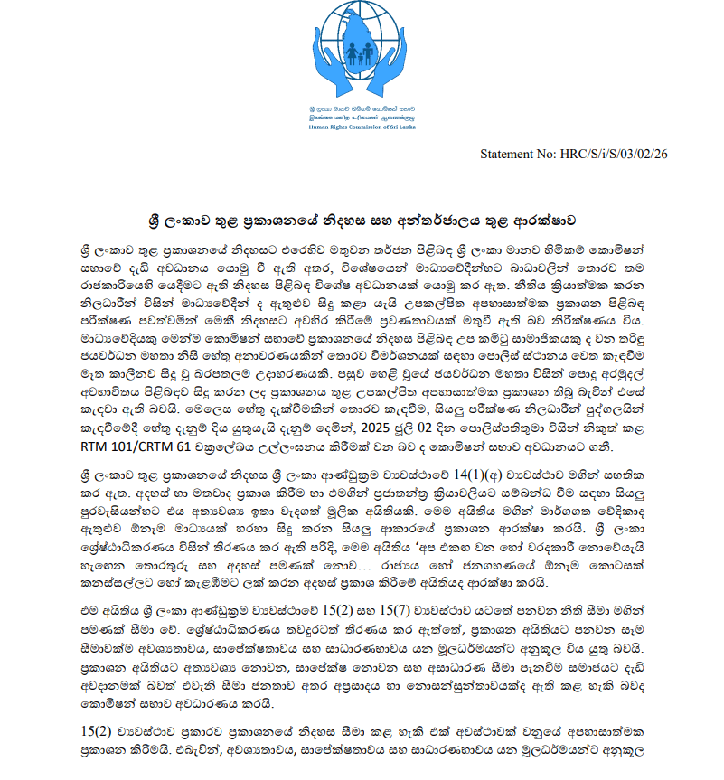 මෙවන් තත්වයක් තුළ ශ්රී ලංකා මානව හිමිකම් කොමිසම විසින් නිකුත් කර ඇති නිර්දේශ ඇතුළත් සම්පූර්ණ නිවේදනය පහතින් දැක්වේ.
