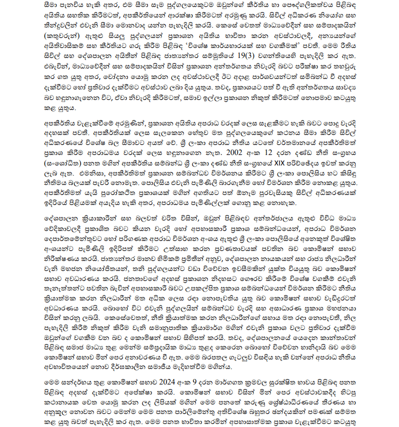 ඒ අනුව, අසත්ය යැයි කියන ප්රකාශ හෝ අපහාස, ශ්රී ලංකාවේ “සාපරාධී වරදක්” නොවන බව සිහිපත් කරමින්, පොලිස්පතිවරයා විසින් ශ්රී ලංකා පොලිසියේ සියලු ම අංශ සහ පොලිස් ස්ථාන වෙත නියමයක් නිකුත් කළ යුතු යැයි ද මානව හිමිකම් කොමිසම අවධාරණය කර ඇත. එහිදී උපකල්පිත අපහාස සම්බන්ධයෙන් පමණක් පැමිණිලි වාර්තා කිරීමෙන් හෝ විමර්ශනය කිරීමෙන් හෝ වැළකිය යුතු බව අදාළ නියමයට ඇතුළත් කළයුතු යැයි ද කොමිසම සඳහන් කර තිබේ.