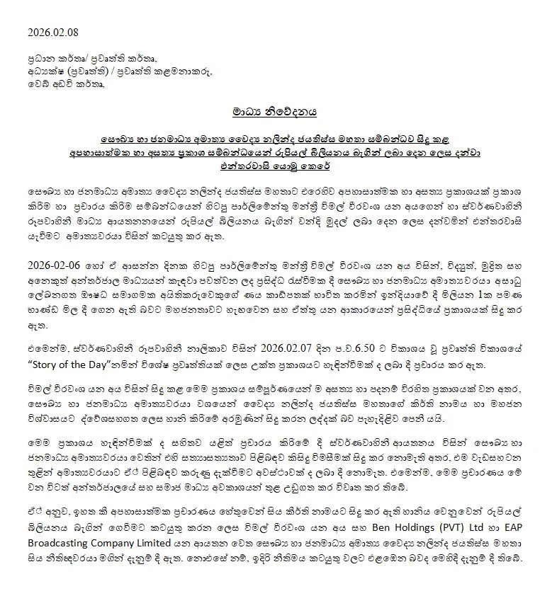 එමෙන්ම එක්තරා පෞද්ගලික රූපවාහිනි නාලිකාවක් විසින් 2026 පෙබරවාරි 7 වනදා පස්වරු 6.50ට විකාශය වු ප්‍රවෘත්ති විකාශයේ විශේෂ ප්‍රවෘත්තියක් ලෙස මෙය ප්‍රචාරය කර ඇති බව ද අමාත්‍යවරයා පෙන්වා දෙයි.