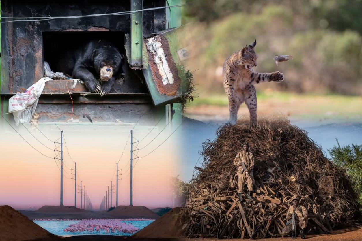 Ready to PounceAn ambush bug nymph waits motionless on a flower for prey to wander within reach. Photograph: Joseph Ferraro/Wildlife Photographer of the YearShareAlong for the RideA juvenile swimming crab hitches a ride on a jellyfish. Photograph: Chris Gug/Wildlife Photographer of the YearShareFlying RodentA young lynx playfully throws a rodent into the air before killing and devouring it. Photograph: Josef Stefan/Wildlife Photographer of the YearShareA Fragile FutureA pangolin pup nestles into the warmth of a blanket at a rescue centre in South Africa. Pangolins are among the world’s most trafficked animals.Photograph: Lance van de Vyver/Wildlife Photographer of the YearShareDark KnightA tiger wanders a reserve deep in Similipal Odisha, India. The tiger, named T12, has pseudo-melanism, a rare genetic condition where its dark stripes are wider. A decade ago, there were fewer than seven tigers left in the reserve and T12 was the only known male, but against all odds, he has fathered new generations. This image offers us a powerful symbol of survival and hope.Photograph: Prasenjeet Yadav/Wildlife Photographer of the YearShareInto the FurnaceA sun bear shelters from the rain in a furnace as a butterfly settles on its snout. A sign on the furnace reads ‘evolution’. Mogens says this is indeed a type of evolution – a wild animal’s opportunistic response to humans disturbing its natural habitat. Photograph: Mogens Trolle/Wildlife Photographer of the YearShareFamily RestA polar bear and her three cubs pause in the summer heat, resting after their long journey north along the Hudson Bay coast in Canada. Shrinking sea ice is making it harder for polar bears to hunt and find food to survive in summer. Photograph: Christopher Paetkau/Wildlife Photographer of the YearShareThe Final PortraitA polar bear cub looks into the camera as it accompanies its mother on an unsuccessful hunting trip. There’s a sad story behind this picture, taken on the coast of Svalbard archipelago in Norway. Soon after it was taken, the polar bear and its family went too close to an area of huts, and people forced them away. Not long after, the mother bear was found dead in the water near the shore. According to reports, she had died of serious internal injuries. Her cub was by her side.Photograph: Nima Sarikhani/Wildlife Photographer of the YearSharePortrait of ExtinctionUgandan wildlife rangers stand in front of pile of snares confiscated over a year in Murchison Falls national park.Photograph: Adam Oswell/Wildlife Photographer of the YearShareBeak-to-BeakA sarus crane shares an intimate moment with its one-week-old chick. Photograph: Ponlawat Thaipinnarong/Wildlife Photographer of the YearShareBond in MotionThe striking eyes of a curious lion-tailed macaque and its infant are on display as it races along a path. The picture immortalises the macaques’ resilience in a world where their future is uncertain.Photograph: Lalith Ekanayake/Wildlife Photographer of the YearShareUniquenessA leucistic otter feeds on a catfish in Mato Grosso do Sul, Brazil. Leucism, a lack of melanin, resulting in pale or white fur. Animals with this condition can be more vulnerable because they don’t have their normal camouflage. Photograph: Daniela Anger/Wildlife Photographer of the YearShareBeauty Against the BeastFlamingos stand out against a stark industrial backdrop. This image shows how spaces designated to protect wildlife carry the signs of human expansion.Photograph: Alexandre Brisson/Wildlife Photographer of the YearShareSwirling SuperpodA spectacular super pod of spinner dolphins herds lanternfish towards the surface of the ocean. Photograph: Cecile Gabillon/Wildlife Photographer of the YearShareNever-ending StruggleA sika deer with the severed head of a rival male that died in their battle skewered on its antler. Photograph: Kohei Nagira/Wildlife Photographer of the YearShareA Leap into AdulthoodThree young kestrels prepare to leap from their nest to a nearby beam. Photograph: Peter Lindel/Wildlife Photographer of the YearShareAbove and BelowA brushtail possum joey mirrors its mother climbing a branch while out foraging. Photograph: Charles Davis/Wildlife Photographer of the YearSharePrecious CargoA cellar spider, also known as a daddy long-legs, carries a ball of eggs in its mouth.Photograph: Thomas Hunt/Wildlife Photographer of the YearShareCouple’s CamouflageA tiny male sits on the abdomen of a well-camouflaged female broad-headed bark spider, waiting until she moults and is ready to mate. Photograph: Artur Tomaszek/Wildlife Photographer of the YearShareDancing in the HeadlightsA pair of young bear cubs play-fight in the middle of a quiet road in Jasper national park in Canada. Bears are a fairly frequent sight in the park, but cubs are rarer because their mothers tend to keep them away from any threats.Photograph: Will Nicholls/Wildlife Photographer of the YearShareA Fleeting MomentAn elusive rufous-vented ground cuckoo plucks up a cicada in the depths of the rainforest in Costa Rica. Photograph: Lior Berman/Wildlife Photographer of the YearShareSolar WavesRows of solar panels stretch across the landscape. This image is part of a project to document the relationship between nature and industry along the River Severn in England and Wales. Photograph: Francesco Russo/Wildlife Photographer of the YearShareMarvellous SpatuletailA male marvellous spatuletail hummingbird shows off its long tail while it feeds on flowers. Photograph: Dustin Chen/Wildlife Photographer of the Year