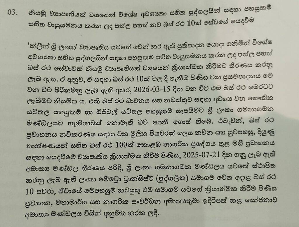 ක්ලීන් ශ්රී ලංකා ව්යාපෘතිය යටතේ වෙන් කර ඇති ප්රතිපාදන යොදා ගනිමින් විශේෂ අවශ්යතා සහිත පුද්ගලයින් සඳහා පහසුකම් සහිත වායුසමනය කරන ලද පත්ල පහත් බස් රථ සේවාවක් නියමු ව්යාපෘතියක් වශයෙන් ක්රියාත්මක කිරීමට රජය තීරණය කර තිබේ.