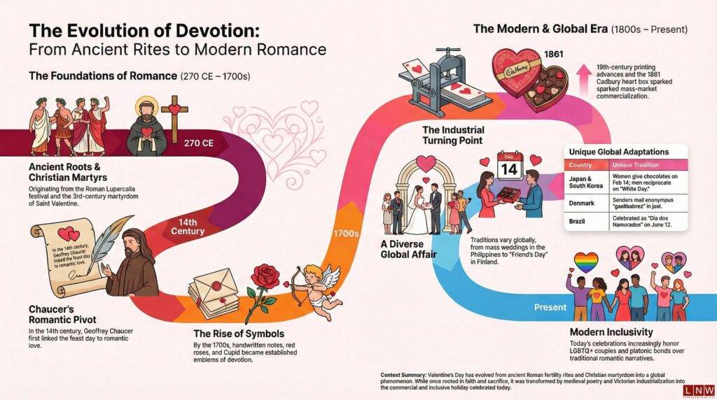 එෙතිහාසික වත්පිළිවෙත්වල සිට නූතන ප්රේමවෘතාන්ත දක්වා වැලන්ටයින් දිනය ඉතිහාසය පුරා පැමිණි ගමන ඇසුවොත් ඔබ පුදුමයට පත්වනවා නොඅනුමාන ය.