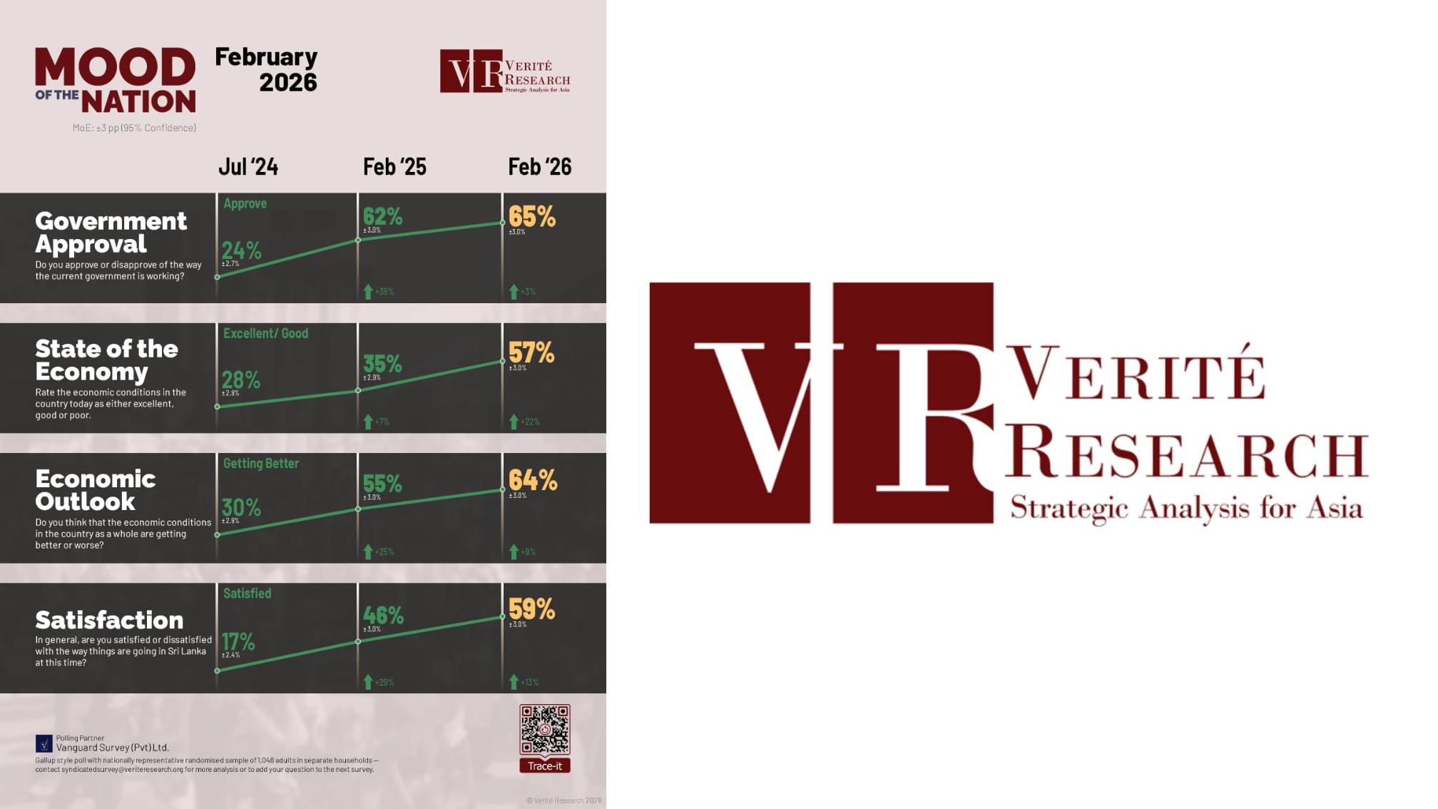පෙබරවාරි 17, LNW (කොළඹ): ප්‍රජාතන්ත්‍රවාදී සමාජවල මහජන විශ්වාසනීය සමීක්ෂණ වැදගත් කාර්යභාරයක් ඉටු කරයි. ඒවා මහජන මතයේ සේයා රූ ලබා දෙයි, මාධ්‍ය ආඛ්‍යානවලට බලපෑම් කරයි, මෙන්ම සමහර විට ආයෝජක හැඟීම් හැඩගස්වයි. කෙසේ වෙතත්, සමීක්ෂණය පවත්වන ආයතනයේ ක්‍රමවේදය, අරමුදල් මූලාශ්‍ර හෝ පාලනය පිළිබඳ ප්‍රශ්න කරන විට, සොයාගැනීම්වල විශ්වසනීයත්වය ඉක්මනින් ඛාදනය විය හැකිය. රජයේ විශ්වාසය 65% ක මට්ටමක පවතින බව පවසමින් Verité Research විසින් මෑතකදී කරන ලද සමීක්ෂණය මේ සඳහා හොඳම උදාහරණයක් බවට පත්ව ඇත.