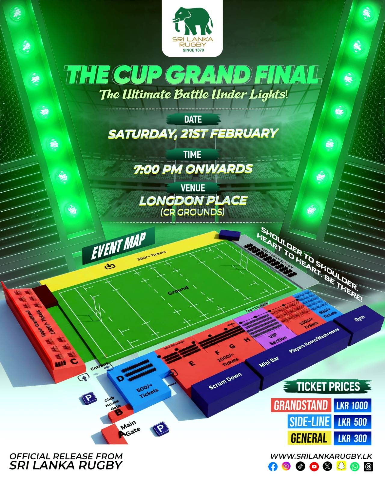 මෙවර මැලිබන් කුසලානය වෙනුවෙන් තරග වඳින ජාතික රගර් ලීග් සූරතාවලියේ අවසාන තරගයට මහනුවර කණ්ඩායම සහ සීආර්ඇන්ඩ්එෆ්සී කණ්ඩායම පැමිණ තිබෙනවා.වත්මන් සූරයන් වන සීආර් කණ්ඩායම එම සූරයාගේ ගෞරවය ඉකුත් වසරේ දිනා ගැනීමට පෙර සූරයන් වූ මහනුවර කණ්ඩායමට මෙවර සීආර් කණ්ඩායම දිනා සිටින සූරතාවය නැවත තමන් වෙත හිමි කර ගන්නට හොඳ අවස්ථාවක් හිමිව තිබෙනවා..තරගය පෙබරවාරි 20 වන දා රාත්රී 7.00 ට ලොන්ඩන් පෙදෙසේ පිහිටි සීආර්ඇන්ඩ් එෆ්සී ක්රීඩාංගණයේදී විදුලි ආලෝකය මධ්යෙය් පැවත්වීමට සියල්ල සූදානම් කර තිබෙනවා.එහි ප්රවේශ පත් බ්රහස්පතින්දා සිට ශ්රී ලංකා රග්බි මූලස්ථානය,33, ටොරින්ටන් පෙදෙස, කොළඹ 07 යන ස්ථානයෙන් ලබා ගත හැක අතර මේ සමඟ ඇති ඡායාරූපයට යොාදා ඇත්තේ ප්රවේශශපත්ර පිළිබද විස්තරයි.