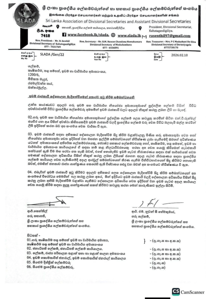 ඉඩම් රාජකාරී ඉටු කිරීමට අදාළව සිදුකරන අහිතකර දේශපාලන මැදිහත්වීම් සම්බන්ධයෙන් සිය විරෝධය පළ කරන බව ශ්රී ලංකා ප්රාදේශීය ලේකම්වරුන්ගේ හා සහකාර ප්රාදේශීය ලේකම්වරුන්ගේ සංගමය පවසයි.