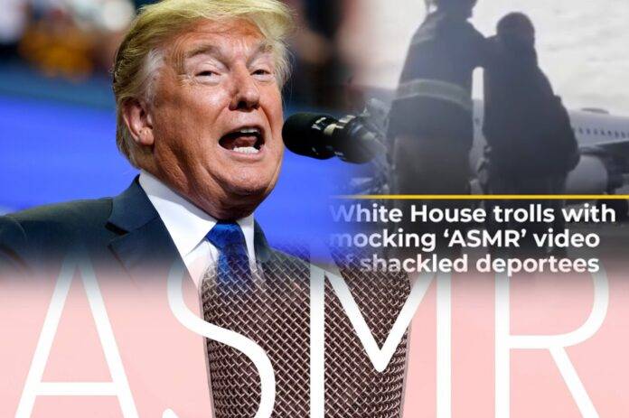 පෙබරවාරි 21, ලෝකය (අවුට්බවුන්ඩ් ටුඩේ): ධවල මන්දිරය සිය නිල සමාජ මාධ්ය ගිණුම්වල නව වීඩියෝ පටයක් පළ කිරීම කාගේත් නෙත ගැටුණු කරුණක්ව හමාරය. ලේඛනගත නොකළ සංක්රමණිකයන් පිටුවහල් කිරීම සමච්චලයට ලක්කරමින්, එය “ASMR අත්දැකීමක්” ලෙස විස්තර කරන ලද මෙම වීඩියෝ පටයේ, දම්වැල්වල ලෝහමය ඝෝෂාව සහ ගුවන් යානා දොරවල් තඳින් වැසීමෙන් ඉස්මතු කරන අතිශයෝක්තියෙන් යුත් ශබ්ද ප්රයෝග සහිතව රැඳවියන් විලංගු දමා පිටුවහල් කරන ලද ගුවන් යානයකට රැගෙන යන සමීප දර්ශන ඇතුළත් විය.