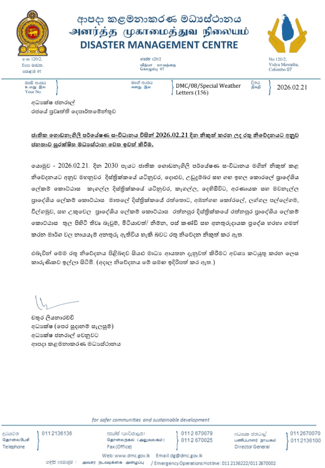 පවතින අධික වර්ෂාපතනය හමුවේ ජාතික ගොඩනැගිලි පර්යේෂණ සංවිධානය විසින් දිස්ත්‍රික්ක 4කට නායයෑම් රතු නිවේදන නිකුත් කර තිබේ.