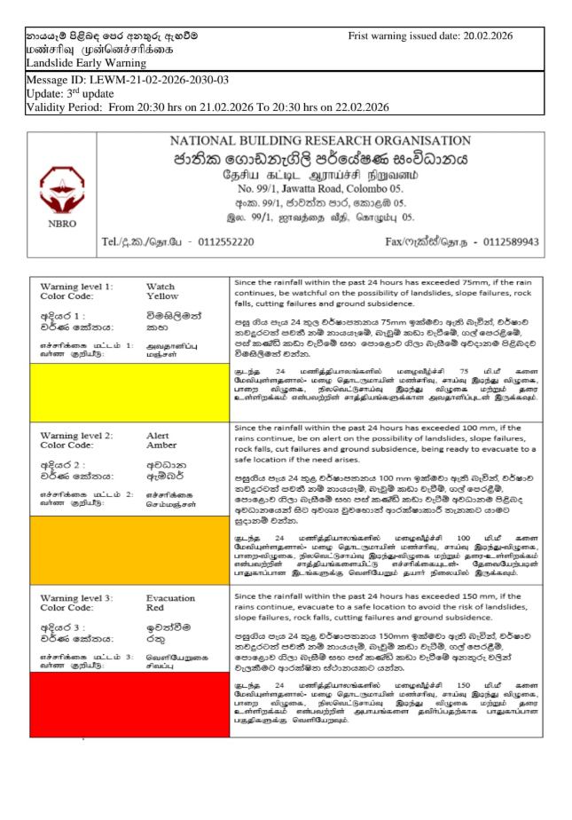 යන ප්‍රාදේශීය ලේකම් කොට්ඨාසවල ත්‍රීව්‍ර බෑවුම් සහිත ප්‍රදේශවල නායෑම් ඇතිවිය හැකි බැවින් එවන් ප්‍රදේශවල සිටින ජනතාවට ආරක්ෂිත ස්ථාන කරා යන ලෙසයි එම සංවිධානය දැනුම් දී ඇත්තේ.