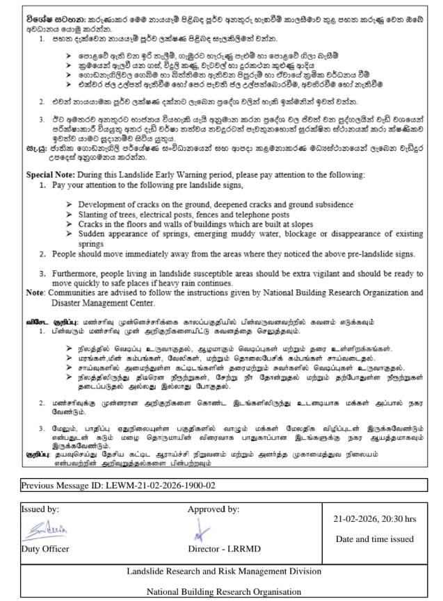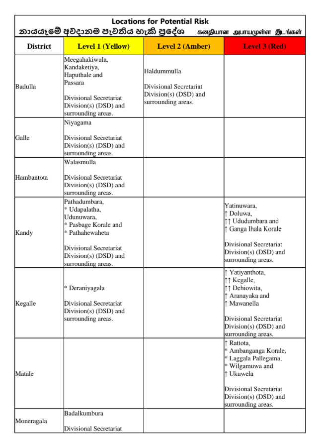 තවත් ප්‍රාදේශීය ලේකම් කොට්ඨාස ගණනකට ද අදියර එක සහ අදියර දෙක මට්ටමේ අනතුරු හැඟවීම් නිකුත් කර ඇති අතර එම සම්පූර්ණ නිවේදනය පහතින් දැක්වේ.