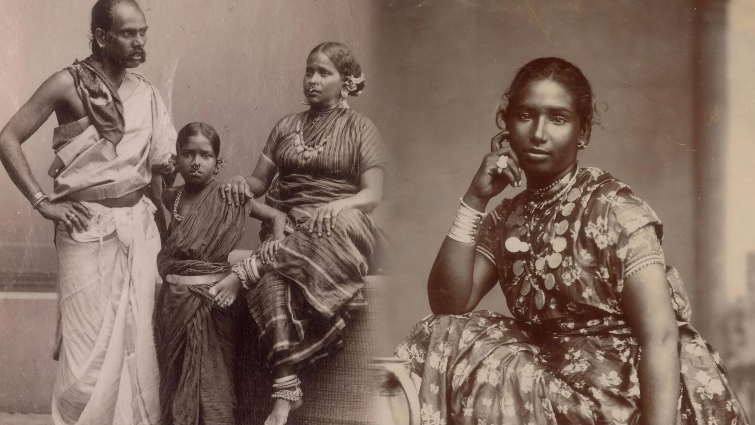 Women carrying cow dung cakes, Bombay, 1890, by Edward Taurines. Here, the women are presented in service to the household, engaged in domestic tasks typically performed within the home – but repositioned outdoors for the camera.Indian woman, photographed by Felix Morin, 1890. Women feature prominently in the photographs at the show. This carefully composed colonial-era portrait captures both the ethnographic gaze of the period and the formal elegance of early photography.This 1862 photograph – ‘Group of Afridis from the Khyber Pass’ taken by Charles Shepherd – shows men from a Pathan tribe the British described as “fiercely independent” found along the Afghan border.A street barber, by an unidentified photographer. Such images frequently captured street trades and everyday performances, turning ordinary labour into ethnographic subjects.William Johnson, a founding member of the Photographic Society of Bombay, published this image titled ‘Brahmani Ladies’ in the 1857 issue of The Indian Amateur’s Photographic Album. The accompanying text named the two women, describing them as young and intelligent, and noted that they were in Bombay – with their father’s encouragement and their husbands’ support – to study English at a mission school.A group of Parsis, possibly photographed by William Johnson, sit before a colonial bungalow – asserting their distinct identity through clothing and bearing, while occupying a colonial architectural world.A group of young Bhutias, 1890. The volume includes photographs of people from Sikkim, Bhutan and Tibet – regions beyond the British rule. The Lepchas, Bhutias and Tibetans were photographed by Benjamin Simpson.Musicians at ancient Buddhist rock-cut shrines in Maharashtra, photographed by Charles Scott, undated.An Indian family in Singapore, late 19th Century. Some images depict people from the Malay Peninsula, Singapore and Chittagong in Bangladesh.