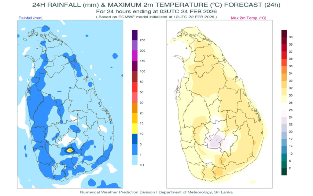 ගාල්ල, මාතර, රත්නපුර සහ හම්බන්තොට දිස්ත්රික්කවල පස්වරු 02.00 න් පසුව ස්ථාන ස්වල්පයක වැසි හෝ ගිගුරුම් සහිත වැසි ඇති විය හැක.