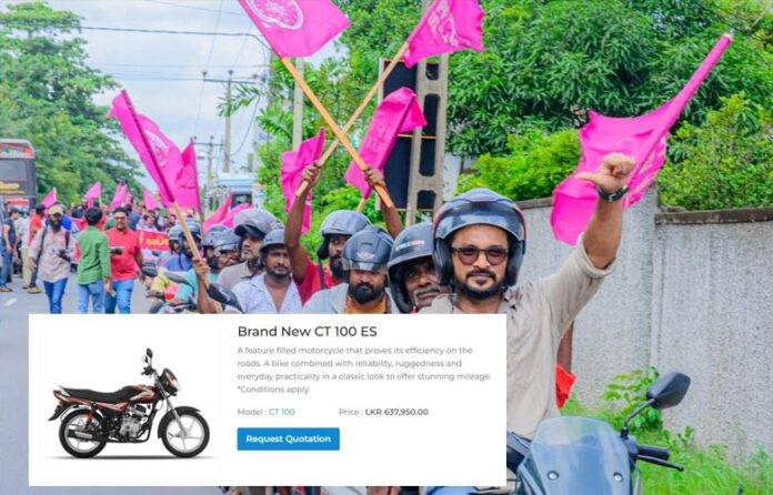 වත්මන් රජය බලයට ගෙන ඒම සඳහා යතුරුපැදි භාවිතා කරන පිරිස් ද දැක්වූයේ දැඩි උනන්දුවකි. ඔවුන් ජාතික ජන බලවේගයේ ප්‍රචාරක කටයුතු සඳහා යතුරුපැදි පෙළපාලි පවත්වනු ඒ දිනවල දක්නට ලැබිණි. දැන් ඔවුන්ට නවතම CT 100 යතුරුපැදියක් මිලදී ගෙන රුපියල් 638,000ක් ගෙවූ‍විට රුපියල් 50ක්ම ඉතුරු වශයෙන් ලබාගැනීමට ද හැකියාව ලැබී ඇත.