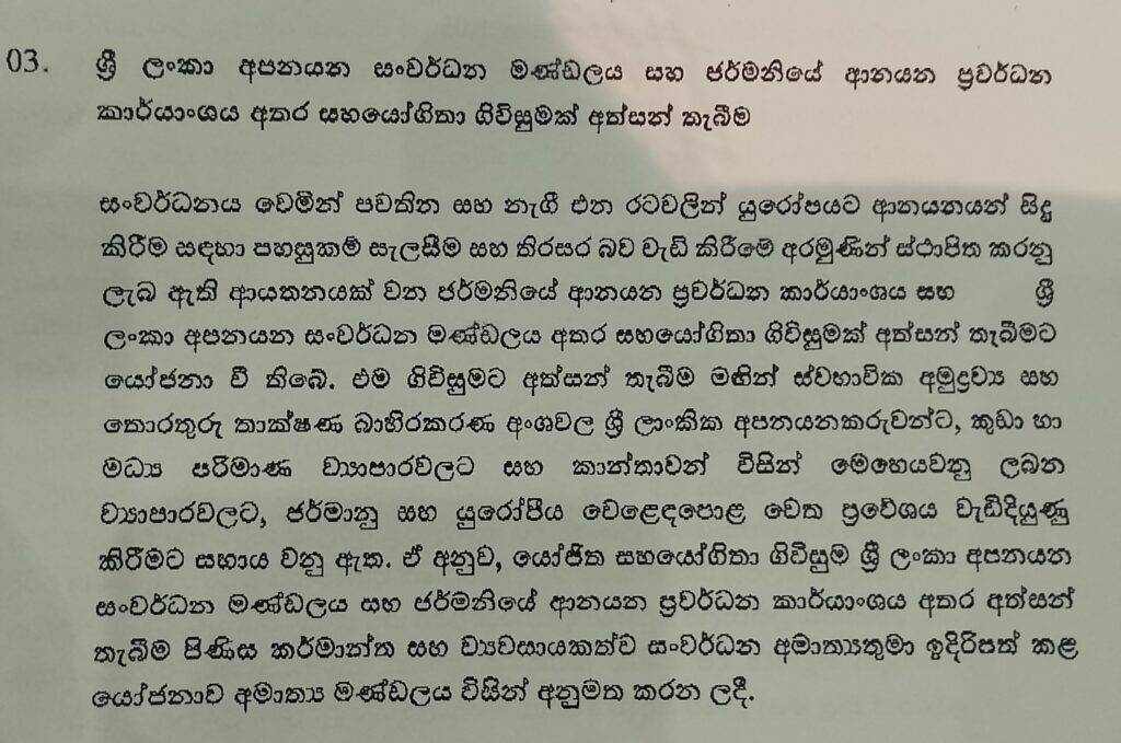 සංවර්ධන පුවත් මෙරට තිරසර බව වැඩිකරන තීරණයක්.. February 24, 2026 0 4 FacebookTwitterPinterestWhatsApp රෂිකා හෙන්නායක පෙබරවාරි 24 කොළඹ LNW : ශ්රී ලංකා අපනයන සංවර්ධන මණ්ඩලය සහ ජර්මනියේ ආනයන ප්රවර්ධන කාර්යාංශය අතර, සහයෝගිතා ගිවිසුමක් අත්සන් තැබීමට කැබිනට් අනුමැතිය ලැබී ඇත .