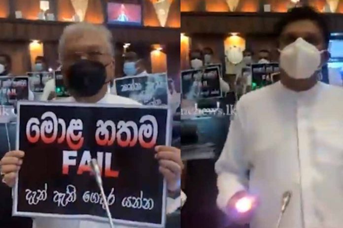 සජබ මන්ත්‍රීවරුන් ටෝච් රැගෙන සභාගැබට. පාර්ලිමේන්තුවේ කලබැගෑනියක් (VIDEO)