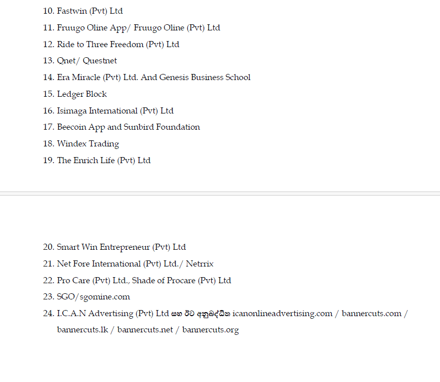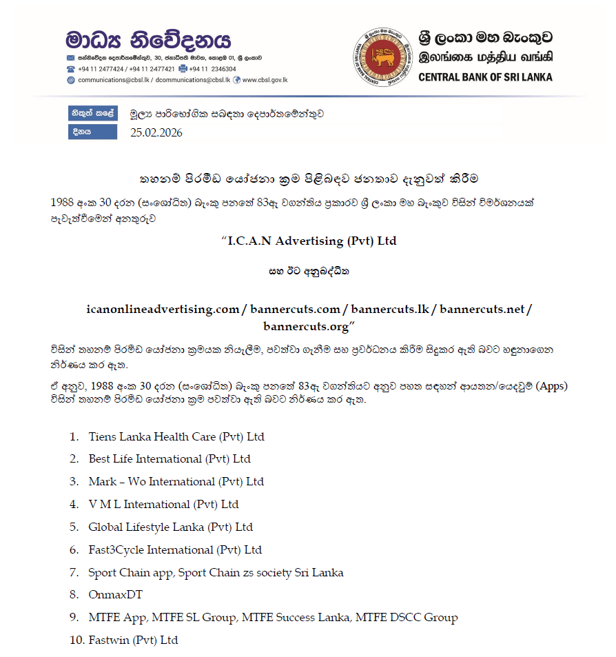 ඒ අනුව මහ බැංකුව විසින්, තහනම් කළ ආයතන සහ යෙදවුම් (Apps) ලැයිස්තුවක් නිකුත් කර තිබේ.