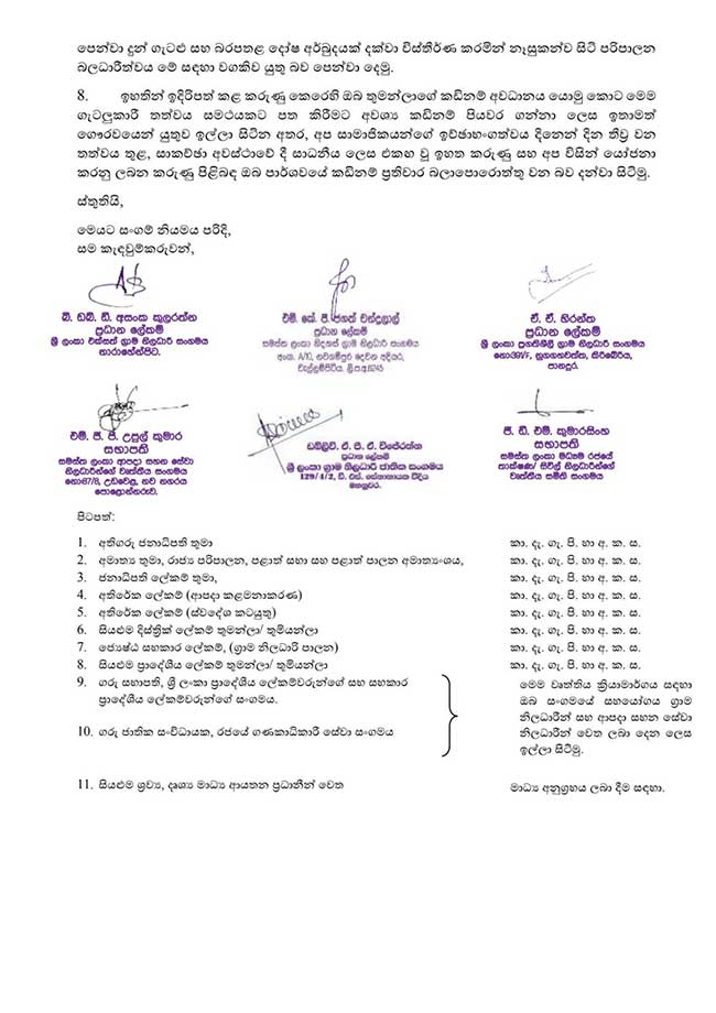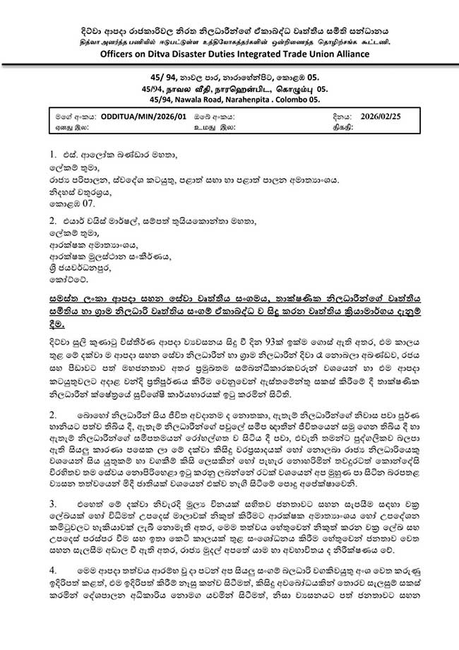 ඒ සම්බන්ධයෙන් සමස්ත ලංකා ආපදා සහන සේවා වෘත්තීය සංගමය, තාක්ෂණික නිලධාරීන්ගේ වෘත්තීය සමිතිය සහ ග්රාම නිලධාරි වෘත්තීය සංගම් එක්ව නිකුත් කළ ඒකාබද්ධ නිවේදනය පහතින් දැක්වේ.