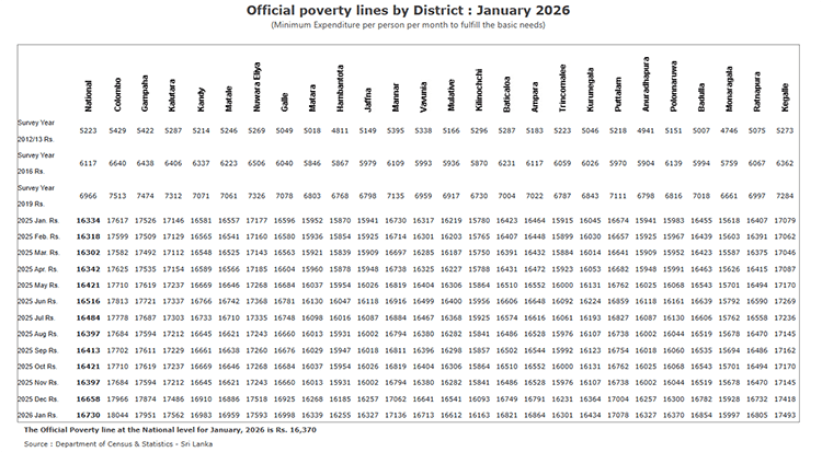 2026 ජනවාරි මාසයට අදාළව ජනලේඛන හා සංඛ්‍යාලේඛන දෙපාර්තමේන්තුව විසින් නවතම දරිද්‍රතා රේඛා සටහන නිකුත් කර තිබේ.