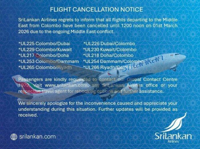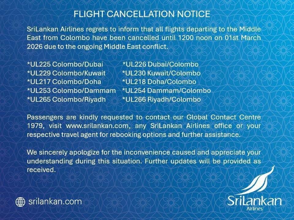 පෙබරවාරි 28, LNW (කොළඹ): යුධමය ආතතීන් උත්සන්න වීම හේතුවෙන් කලාපීය ගුවන් කලාපය වසා දැමීම හේතුවෙන් මැදපෙරදිගට යන සහ ඉන් පිටතට යන ප්‍රධාන ගුවන් ගමන් කිහිපයක් අද වහාම අවලංගු කරන බව ශ්‍රී ලංකන් ගුවන් සේවය නිවේදනය කර තිබේ.