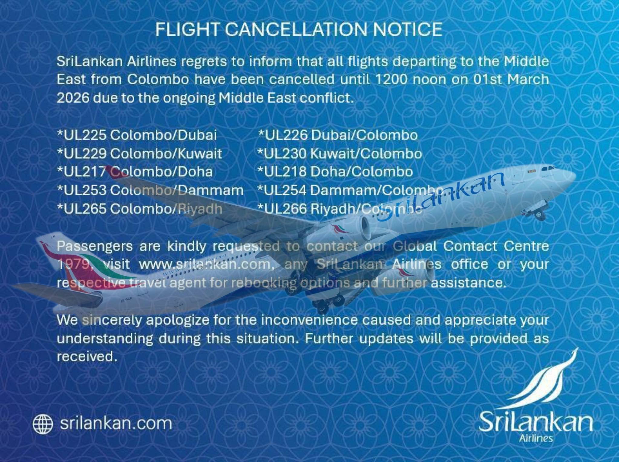 යුධමය ආතතීන් උත්සන්න වීම හේතුවෙන් කලාපීය ගුවන් ගමන් කිහිපයක් අවලංගු කරන බව ශ්‍රී ලංකන් ගුවන් සේවය නිවේදනය කරයි!