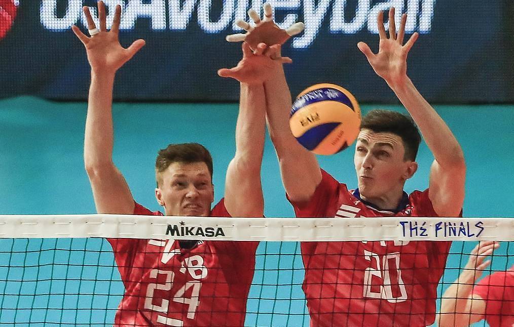 epa07711291 Russia's Igor Kobzar (L) and Russia's Ilyas Kurkaev (R) in action during the FIVB Volleyball Men's Nations League match between France and Russia at Credit Union 1 Arena in Chicago, Illinois, USA, 11 July 2019. Russia defeated France. EPA-EFE/TANNEN MAURY